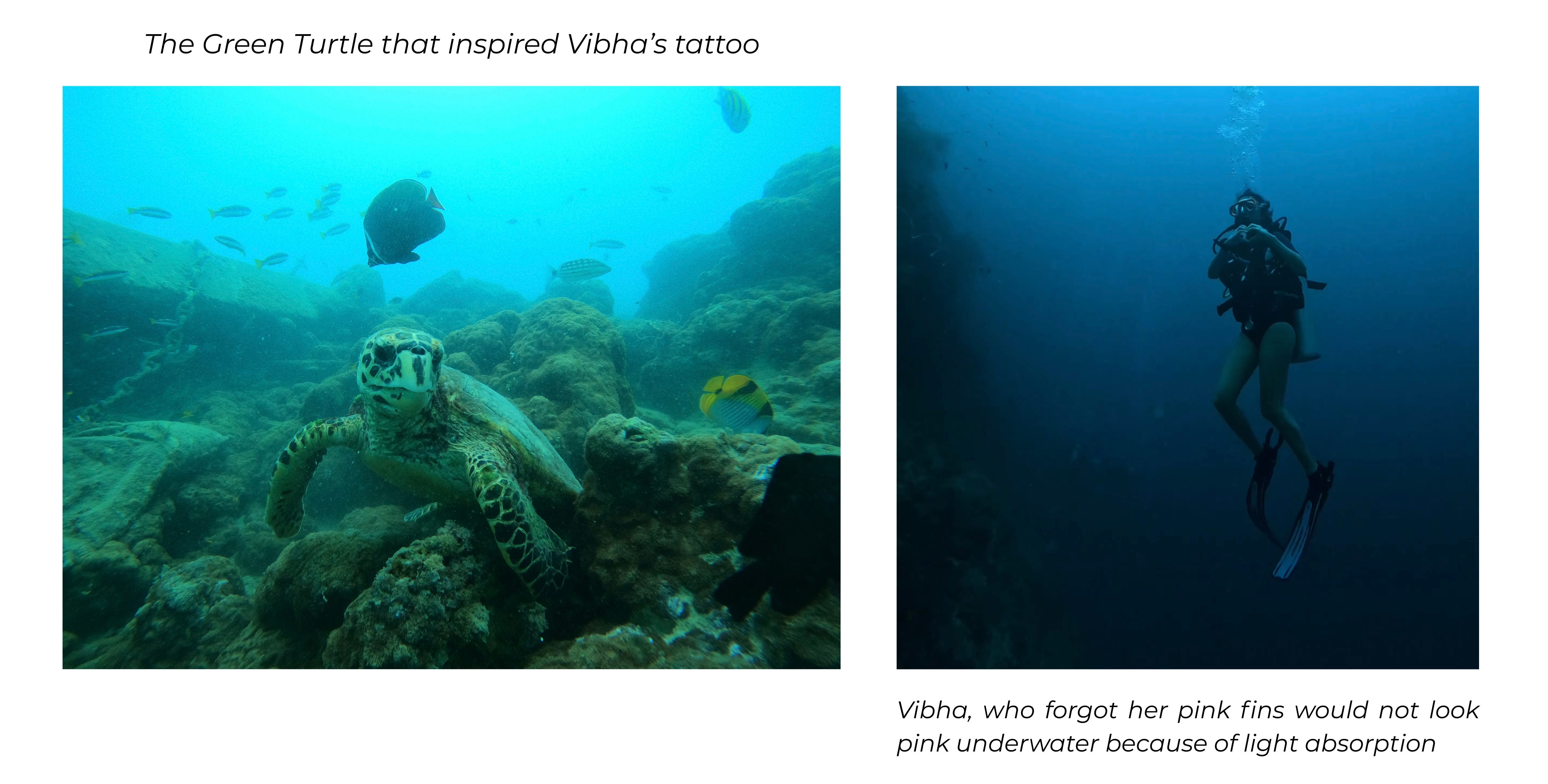 Converse to Vibha’s experiences, diving helps remind me how truly small and insignificant I am. For instance, the whales that I encountered on my dive, at times so close that I had to curtail my urge to reach out and touch them, can grow to ~60 ft in length, and can be as old as 70 years. The whale sharks we encountered float through the ocean like large unencumbered UFOs. The mother and calf sperm whales I dove with, met us with curiosity as opposed to animosity despite our kind’s cruel history with theirs. You see the scars that these gigantic creatures bear across their body from hunting giant squid so deep below the sea that light doesn’t pierce through at those depths. It’s so deep, that humans haven’t been able to capture these hunts on camera.