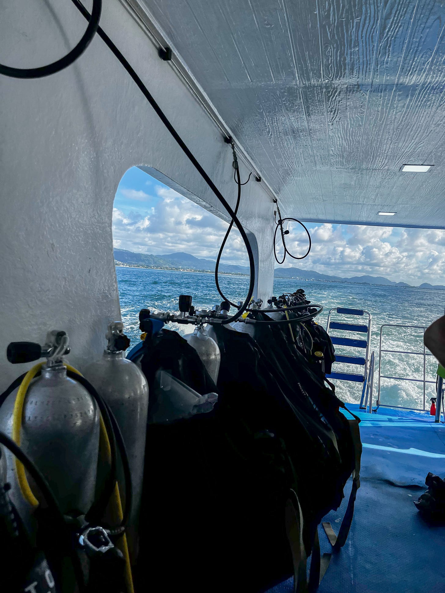 Joseph usually checks out at this point to leave me with the equipment inspection and set-up. I inspect both of our gear, and assemble it by routine, checking the tanks for defects, attaching the buoyancy control device or BCD, and ensuring the regulator is dispensing air properly. As you approach the dive site over choppy waters, the dive master calls everyone to the deck for a briefing on the current, topography, and marine life to watch out for. We disperse after the briefing, back to our own corners of the boat. Some visualise the route. Some catch up on sleep.