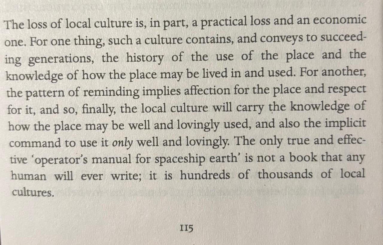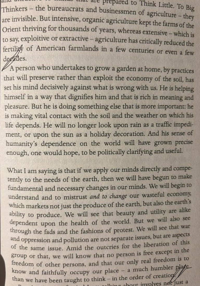 I have come to Wendell Berry very late in my life. But as they say in these parts - der aye durust aye. World Ending Fire is a collection of some of his finest essays. Reading across seminal pieces such as Think Little, Nature as Measure, The Total Economy and The Work of Local Culture, I found so much that resonates with my own discontent with the current construct of the ‘modern life’ as we build it and live it.