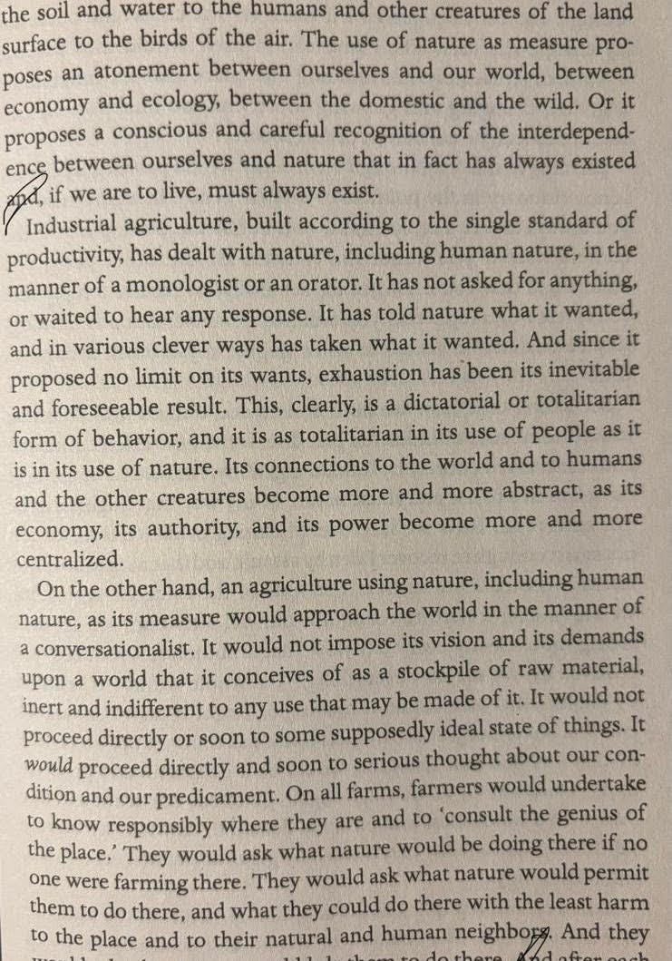 In Nature as Measure, Mr. Berry speaks about the impact of the standard of “productivity” that has come to dominate our economic and social life. The natural consequence of this is the complete exhaustion of the earth, most evident in the loss of our soil, the weakening of local economies, and - I might add - a global mental health crisis.