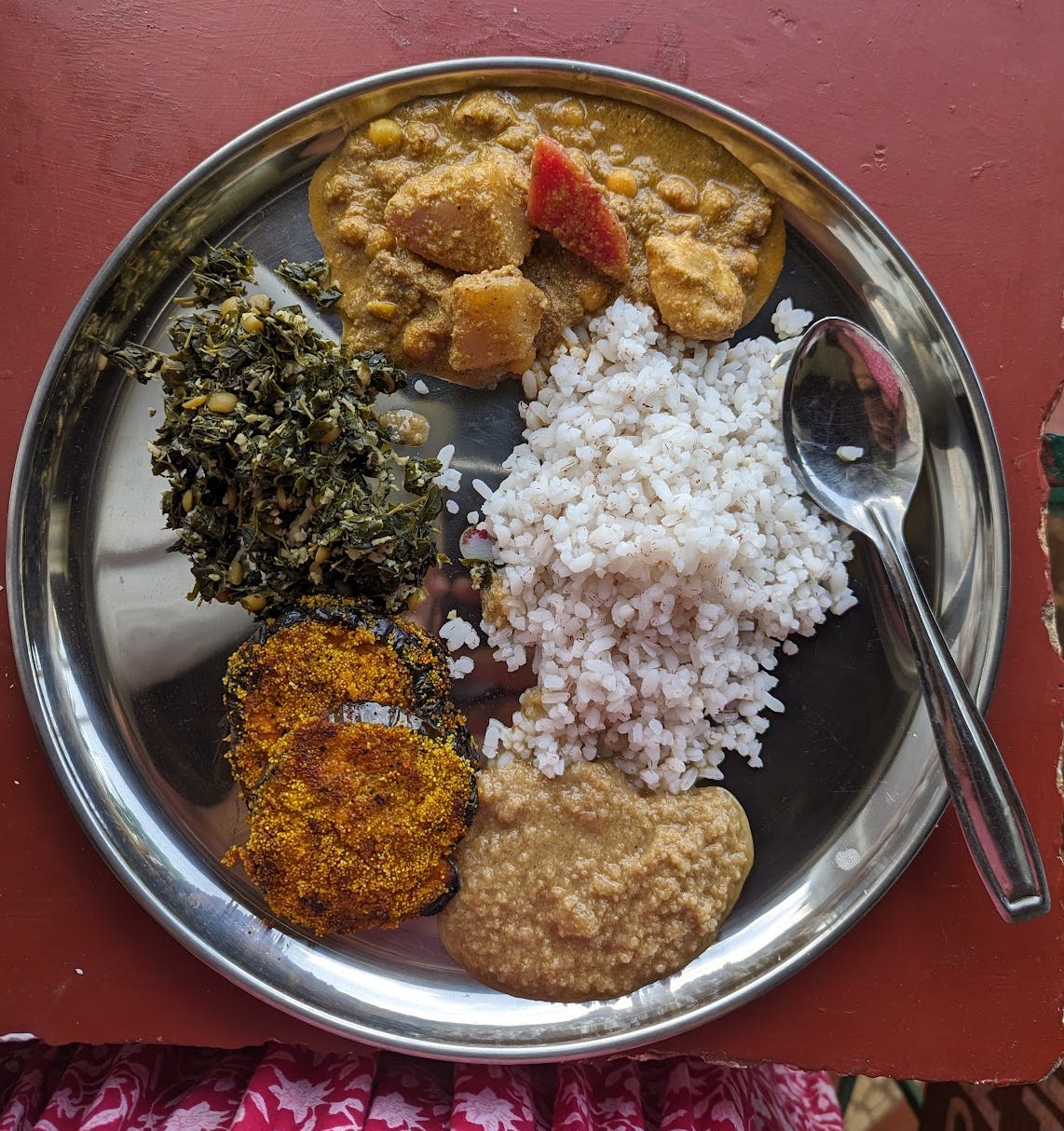 By lunch, the spell had loosened into chatter. The meal was sattvic: moringa bhaji, rava fry, local rice, barnyard millet payasam. Plates moved and conversations braided: lawyers, conservationists, artists, shoulder to shoulder.4