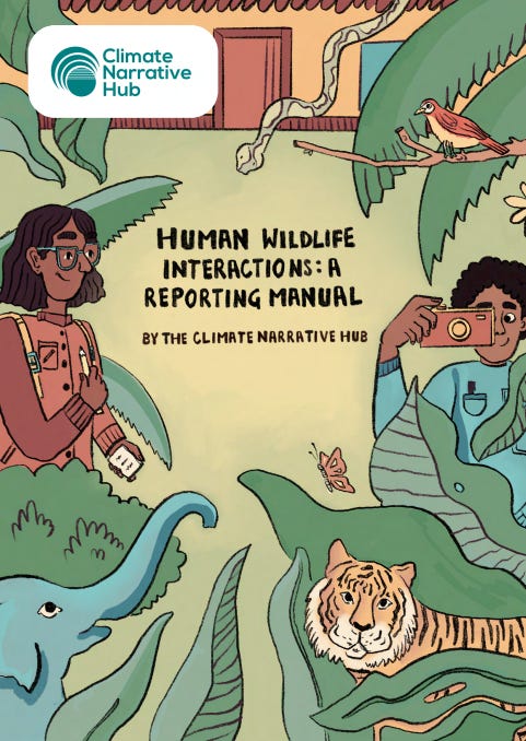 Finally, here is a manual on human–wildlife reporting that has just come out last week. 17 pages long and brought to us by the Climate Narrative Hub, the manual insists that stories about wildlife do not have to begin and end with conflict. Most coverage defaults to crisis: “conflict,” “attack,” “man-animal encounter,” with humans as the obvious centre of moral gravity, and that is exactly what the manual pushes against.