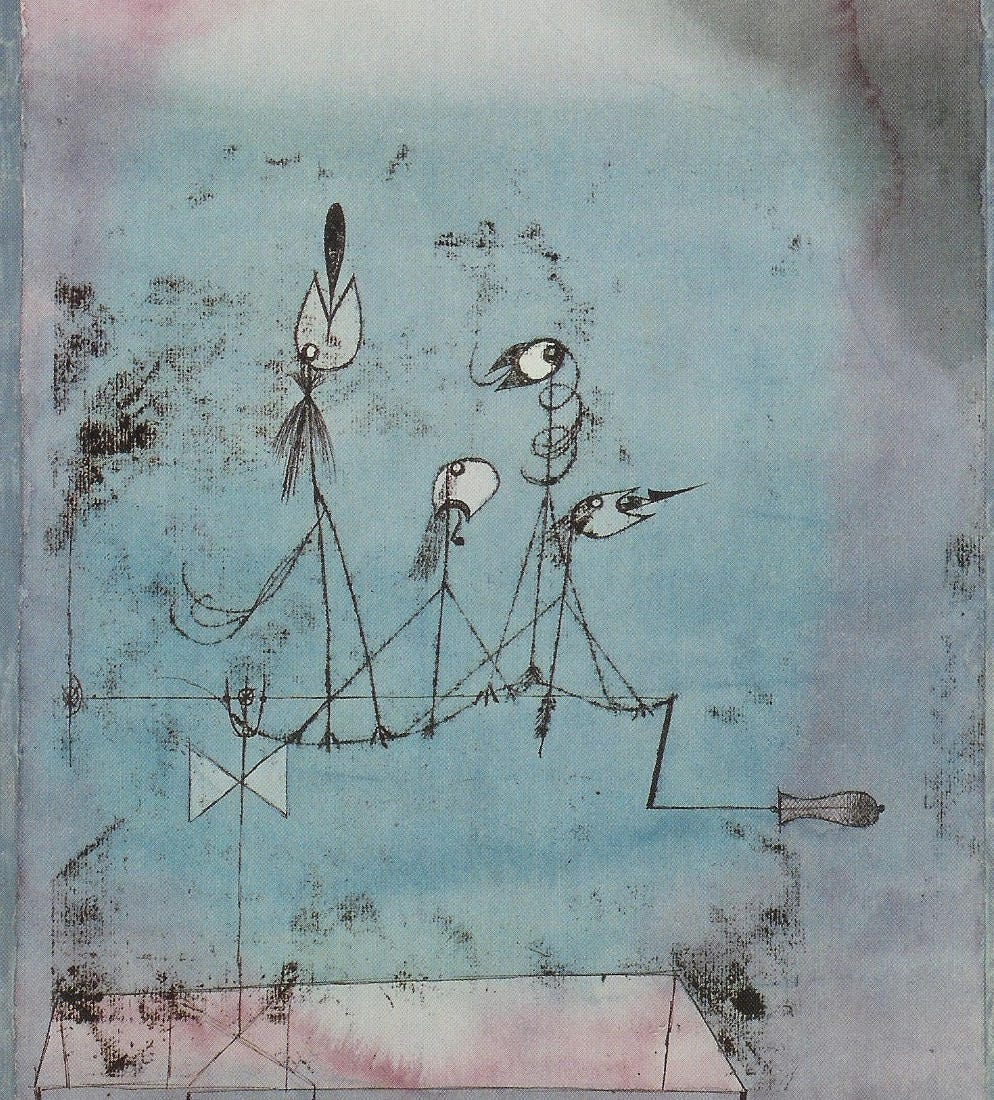 Klee painted these mechanical birds during the rise of recording technology, when we first tried to capture natural sounds mechanically. He knew: our cleverest inventions are just crude translations of what already sings.