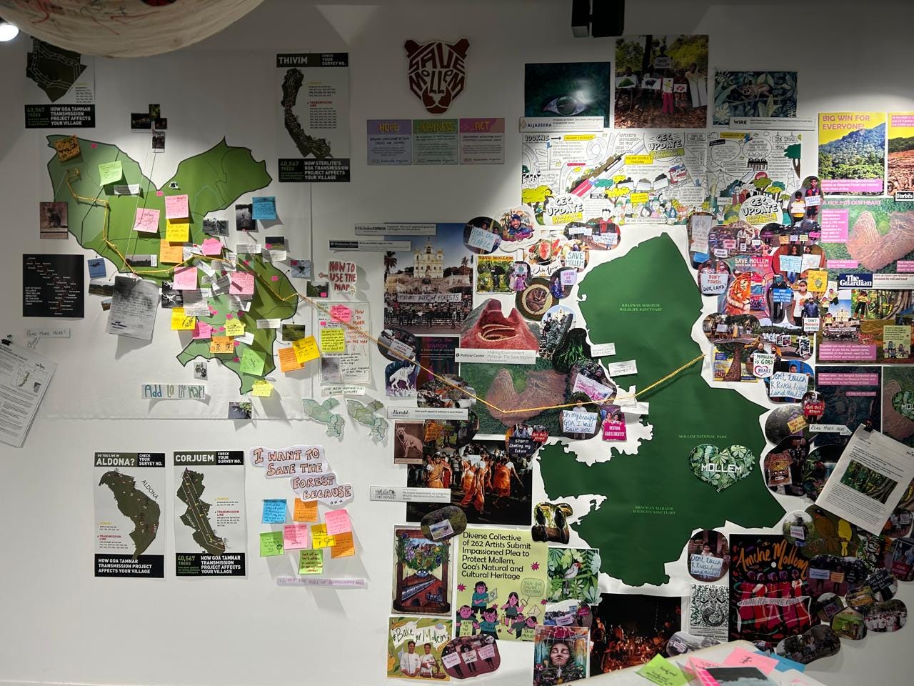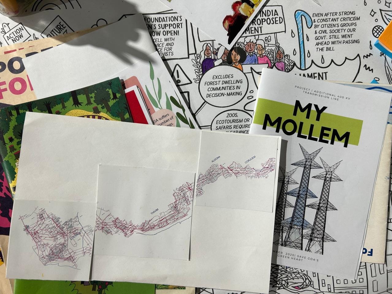 Closer home, at an exhibit at Arthshila in Nachinola, Goa, a counter-mapping exercise has been underway all summer. I reach out to Rhea for a walk-through of the map she led the creation of, on behalf of the Amche Mollem Campaign, for the Kaghazi Pairahan exhibit. The map takes the shape of a wall-sized collage: including photos, notes, anecdotes, memories, local landmarks for reference, and a thread that originates in the forests of Mollem in South Goa and cuts across the state to reach the villages of Aldona, Corjuem, Tivim, and Colvale in North Goa, neighbouring where we are now. The thread follows the route of the proposed Goa Tamnar Transmission line, one of the three infrastructure projects in Goa that citizens and lawyers have been advocating against for the last five years.